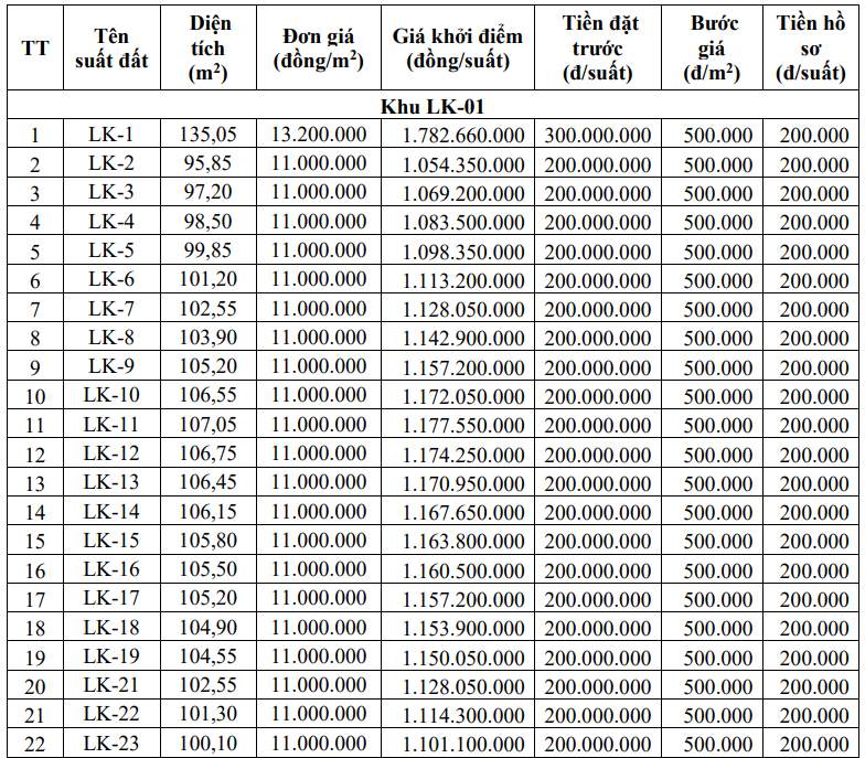 公表情報によると、土地の面積は95〜173m2で変動し、開始価格は11〜1320万ドン/m2、つまり1〜2億ドン/suatです。資産の総開始価格は60 408 810 000ドンです。この価格には、落札者が支払う必要がある規定の税金、手数料、その他の金融義務は含まれていません。