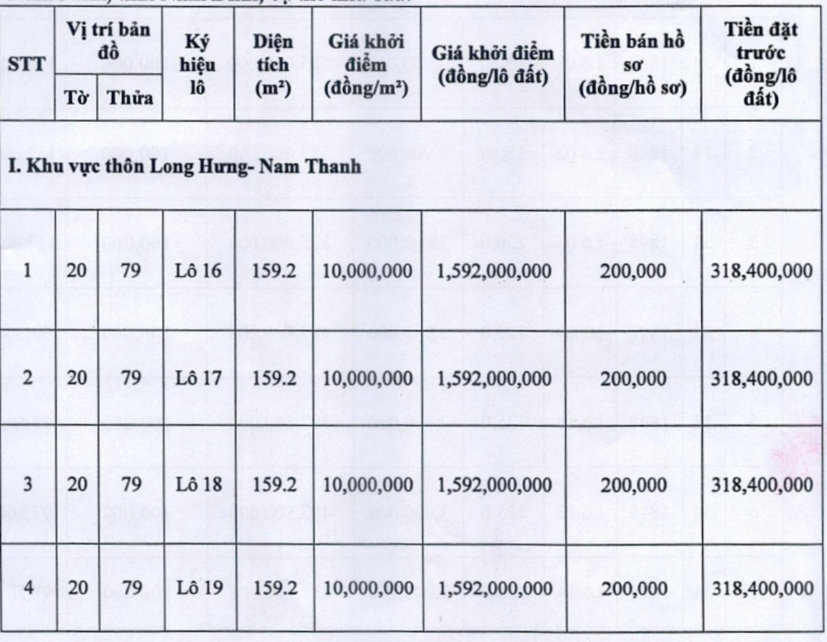 競売形式は、各土地区画に対して1回の直接投票を行い、価格引き上げ方式を適用することです。支払価格は1平方メートル単位で計算され、数百ドンも小さめではありません。同時に、参加資格のあるすべての土地区画に対して一斉投票を行います。