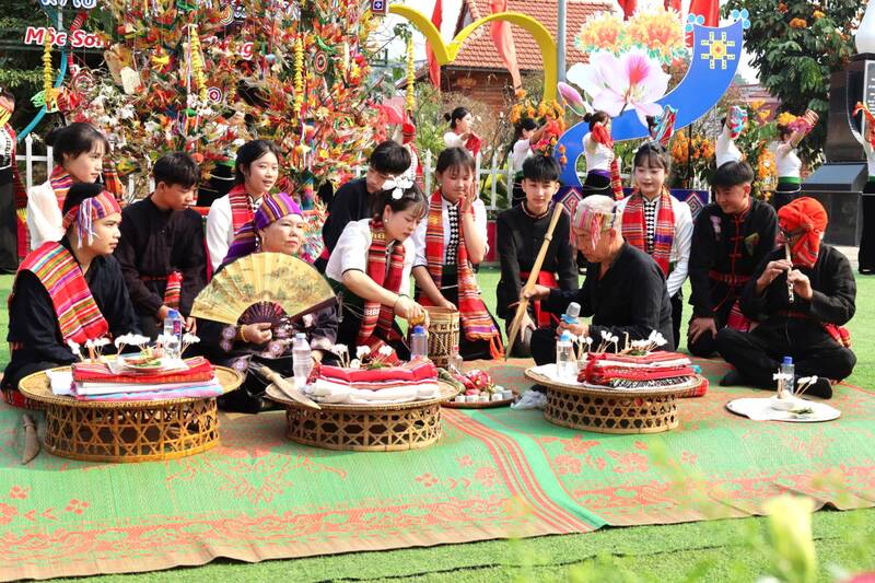 祭りの締めくくりは団結ダンスの輪で、人々や観光客が伝統的なダンスで手をつなぎ、一緒に竹筒酒を飲み、喜びを分かち合います。そのイメージは、モクチャウ高原におけるタイ文化のコミュニティ精神と持続的な生命力を明確に示しています。