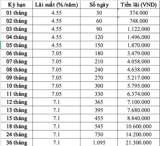 Bac A Bankに1億ドン預金すると、期間ごとにいくらの利息を受け取れますか?