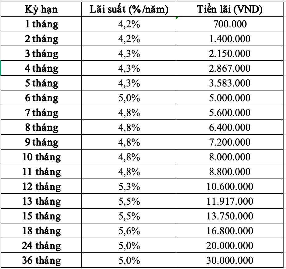 したがって、36ヶ月の期間で、受け取る利息は3000万ドンに達します。