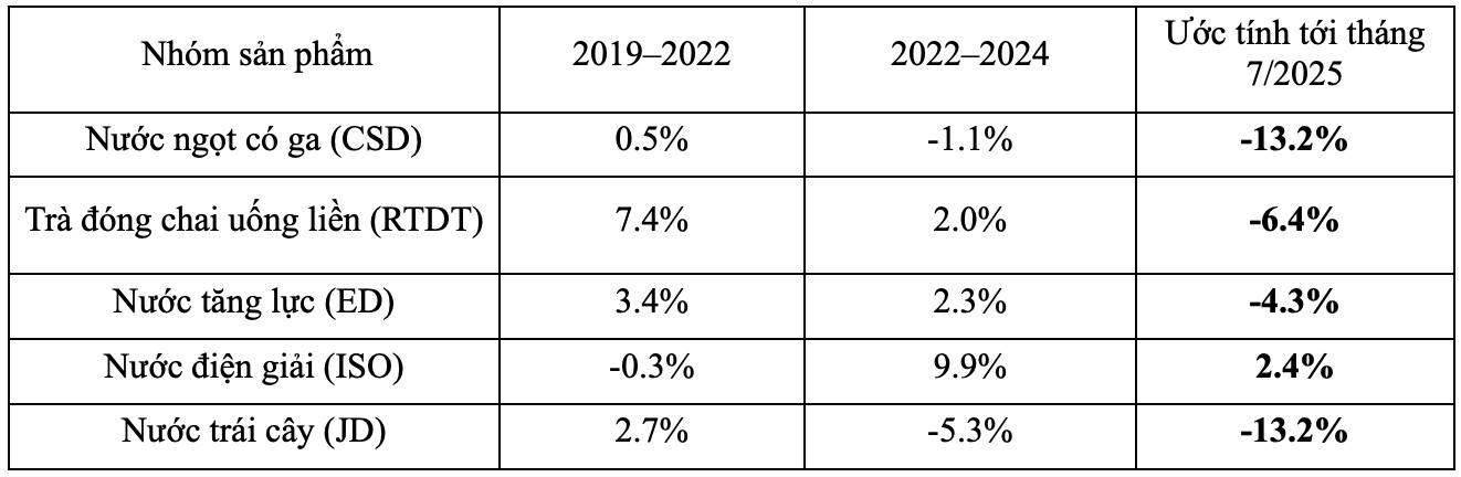 2019年から2022年の期間の業界全体の成長率は3.2%でしたが、2022年から2024年の期間には成長が1.1%に鈍化し、購買力と消費需要の明らかな弱体化を反映しています。2025年7月までに、前年同期比マイナス-7.8%の成長となり、成長が鈍化から実際の減少へと転換したことを示しています。特に、一部の飲料製品グループでは、具体的に次のとおりです。