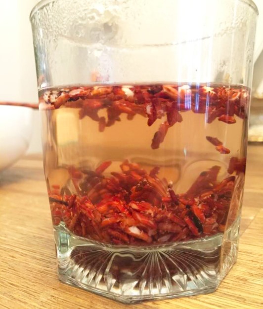 - 米1/2カップをコップ1杯の水に入れ、3時間浸します。