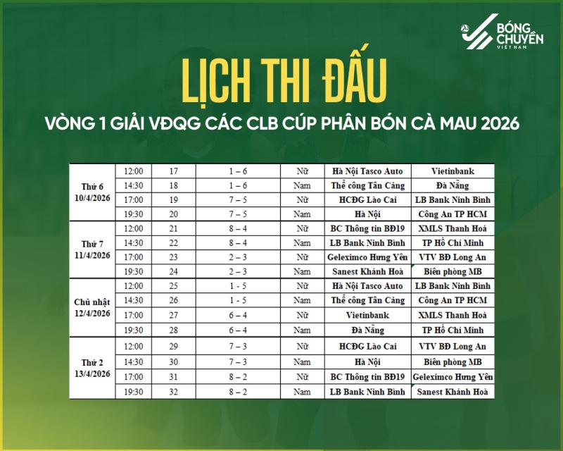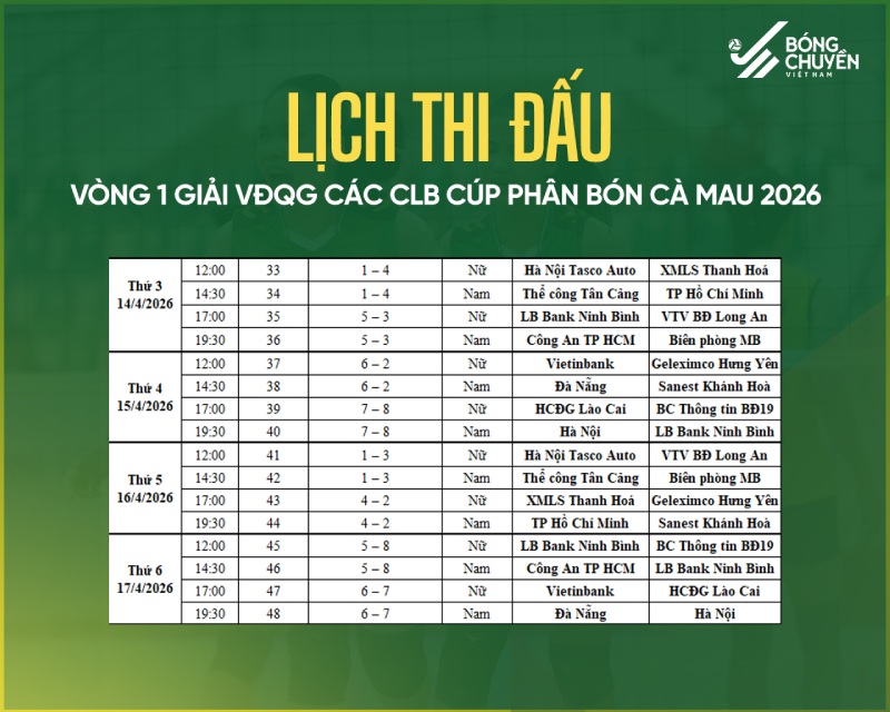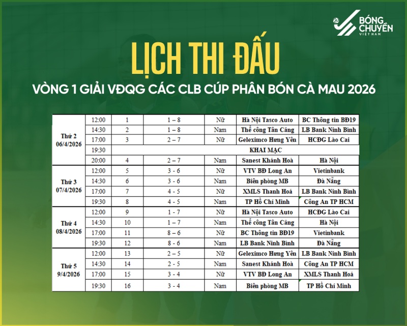2026年全国クラブバレーボール選手権の第1ラウンドは、4月6日から4月19日までドンアイン(ハノイ)で開幕します。