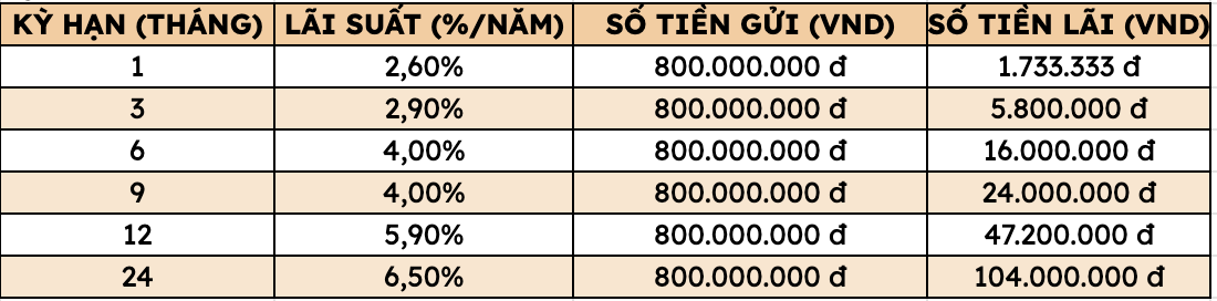 アグリバンクに8億ドンを預金すると、期間ごとにいくらの利息を受け取れますか?