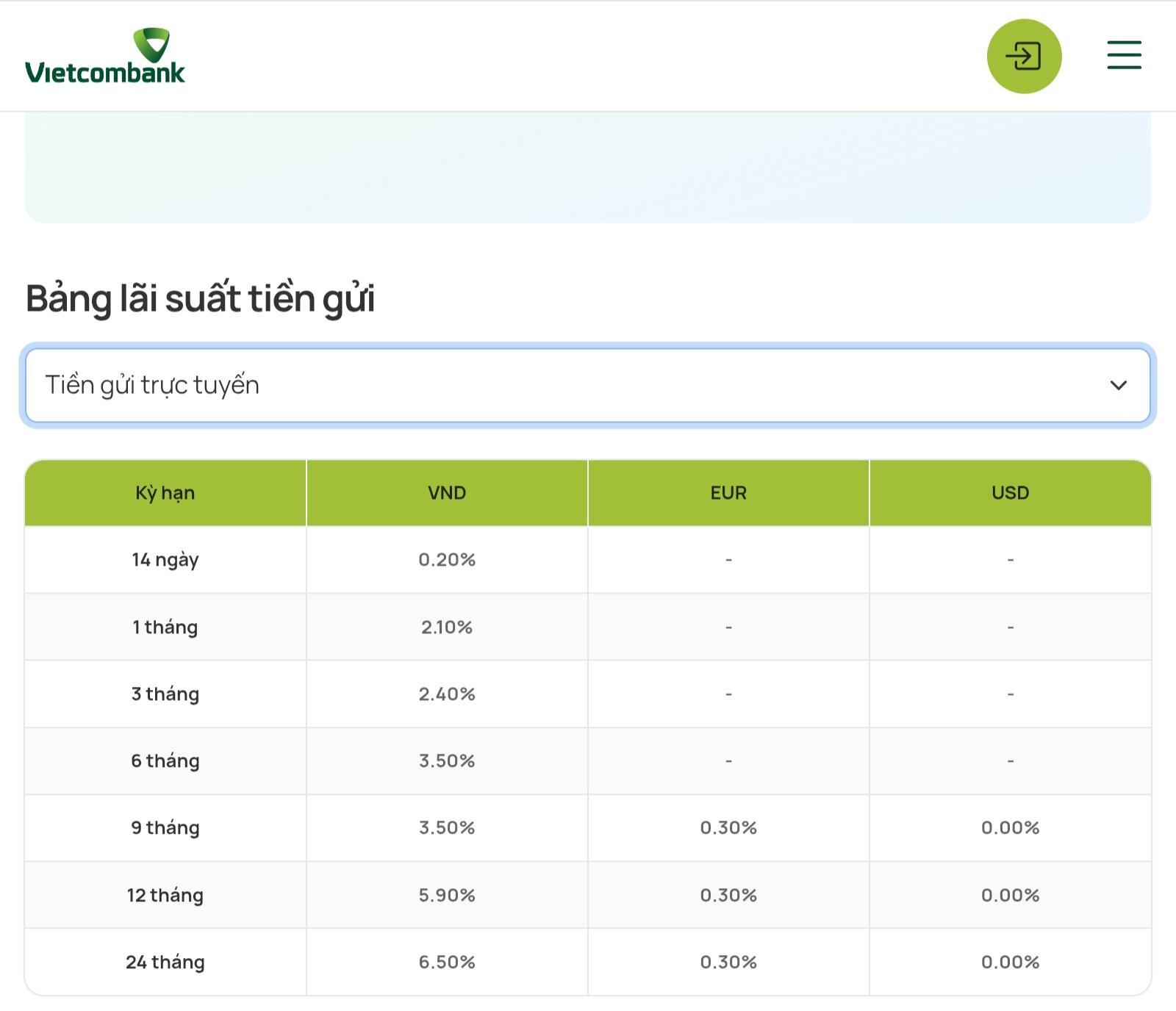 3つの銀行が具体的に掲示している個人顧客向けのオンライン預金金利表は次のとおりです。