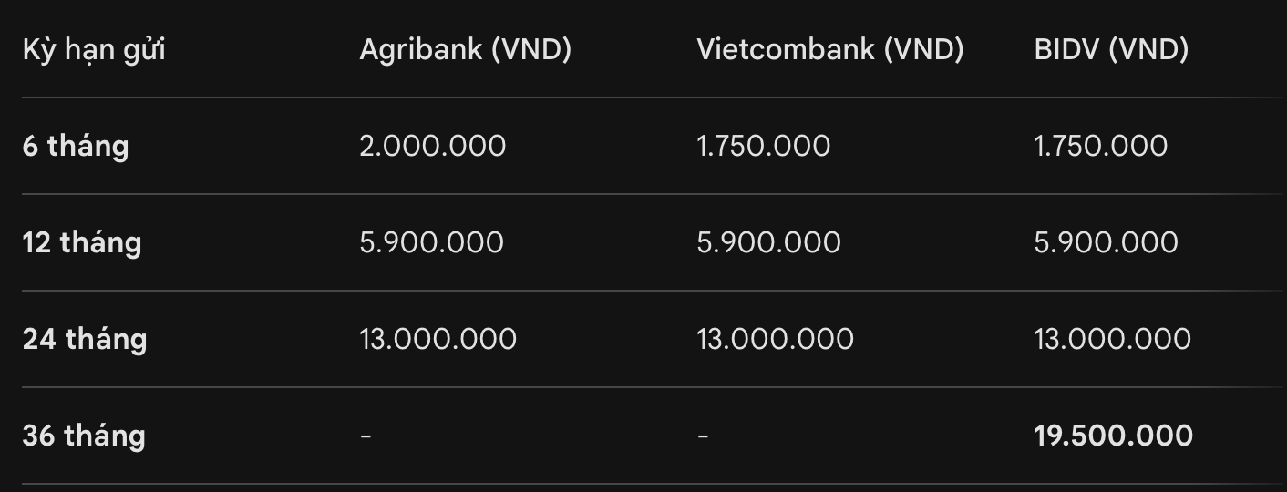 したがって、BIDVに1億ドンを最長36ヶ月の期間で預金することを選択した場合、満期時に受け取る利息の総額は1950万ドンに達します。24ヶ月の期間では、3つの銀行すべてが同額の期末利息である1300万ドンを支払います。