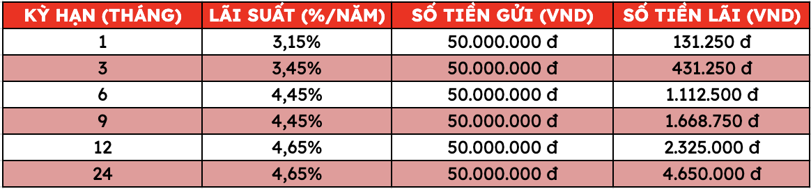 Techcombankで5000万ドンを預金すると、各期間でいくら利息を受け取るのですか?