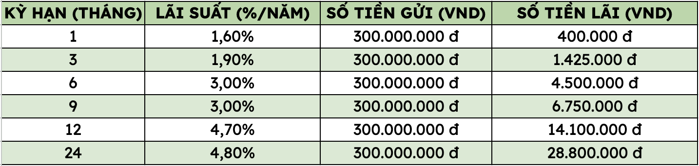 VietinBankで3億ドンを預金すると、各期間でいくら利息を受け取るのですか?