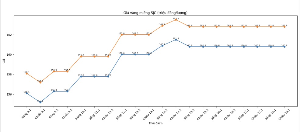 2026年1月18日の取引セッションの終値で、サイゴンSJC宝飾会社はSJC金地金の価格を1テールあたり1608万〜1628万ドン(買い - 売り)で表示しました。先週のセッションの終値(2026年1月11日)と比較して、SJC金価格は両方向で1テールあたり300万ドン上昇しました。しかし、買い - 売りの差は1テールあたり200万ドンで維持されており、投資家の利益率が縮小しました。