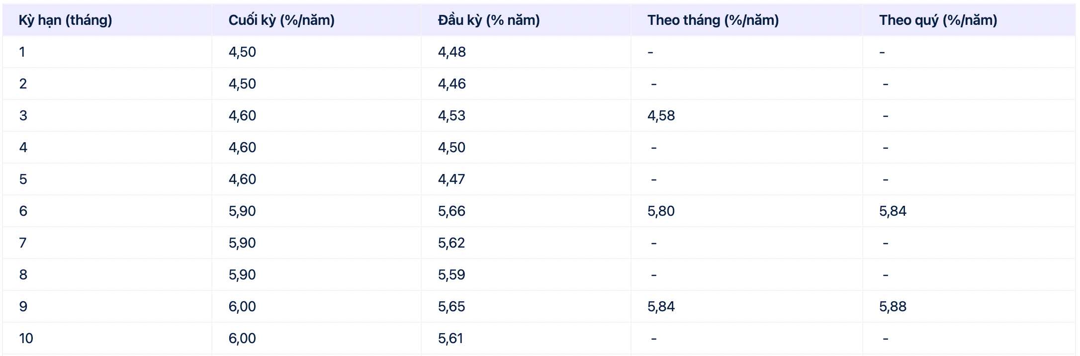 Cake by VPBank は、顧客が期間終了時に利息を受け取る場合、12 か月期間の最高金利を年 6.1% としています。期首、月次、四半期ごとに利息を受け取る顧客は、5.64% の利率を受け取ります。 5.88%; 5.92%。