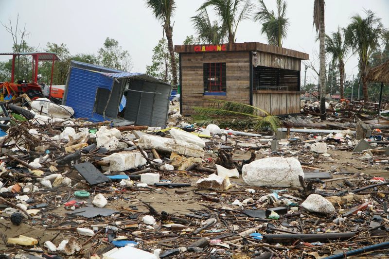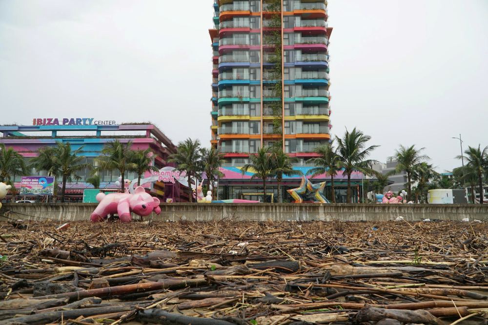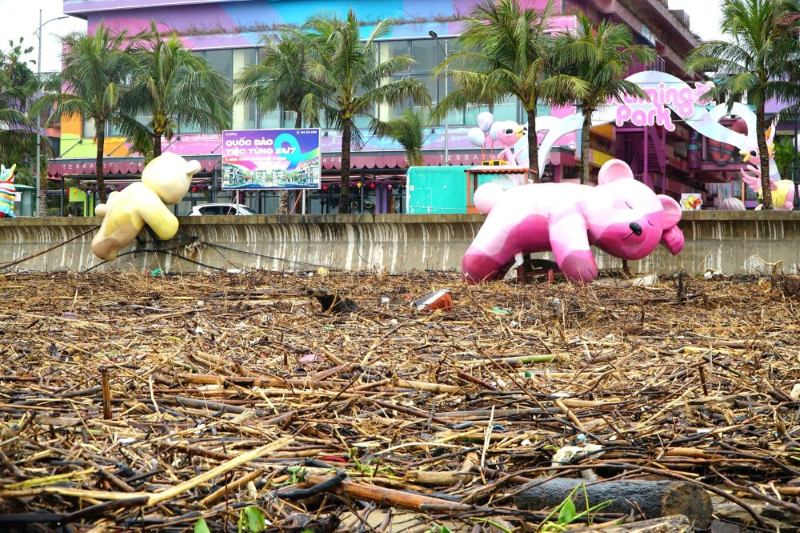 地元住民によると、台風10号の後、海辺沿いのハイティエン観光地は薪、木、ゴミで覆われており、全長約1kmです。