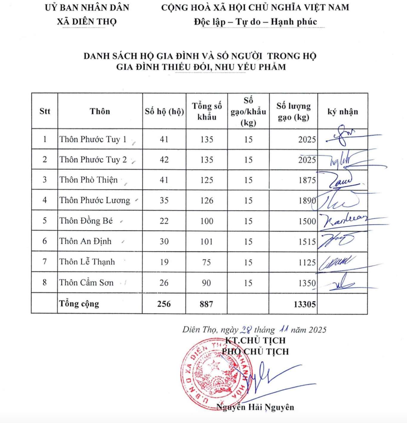 Đại diện UBND xã Diên Thọ khẳng định, toàn bộ 13.305kg gạo đã được cấp phát đầy đủ cho các hộ dân thuộc diện được hỗ trợ.