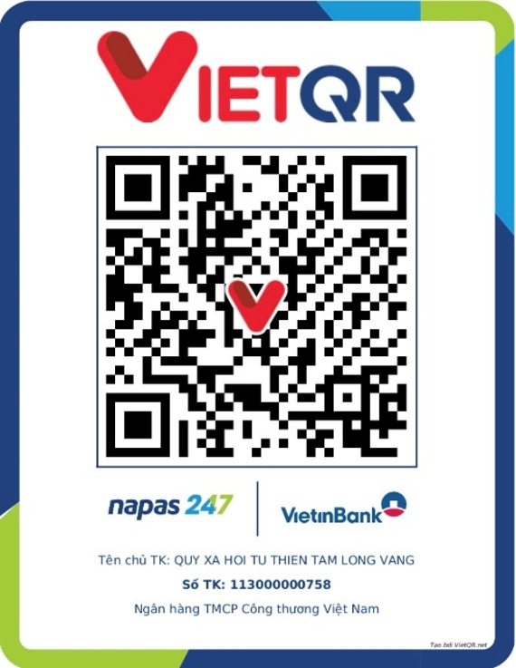 すべてのヘルプを送ってください:ゴールデンハートの社会主義基金、No。51ハンボ、ホアンキエム、ハノイ。電話:024.39232756。アカウント番号(STK):113000000758 at Vietinbank Hoan Kiem Branch、Hanoi。 STK:0021000303088 -Vietcombank -Hanoi Branch、Stk:12410001122556 -Bidv -Hoan Kiem Branch。または、次のQRコードをスキャンします。