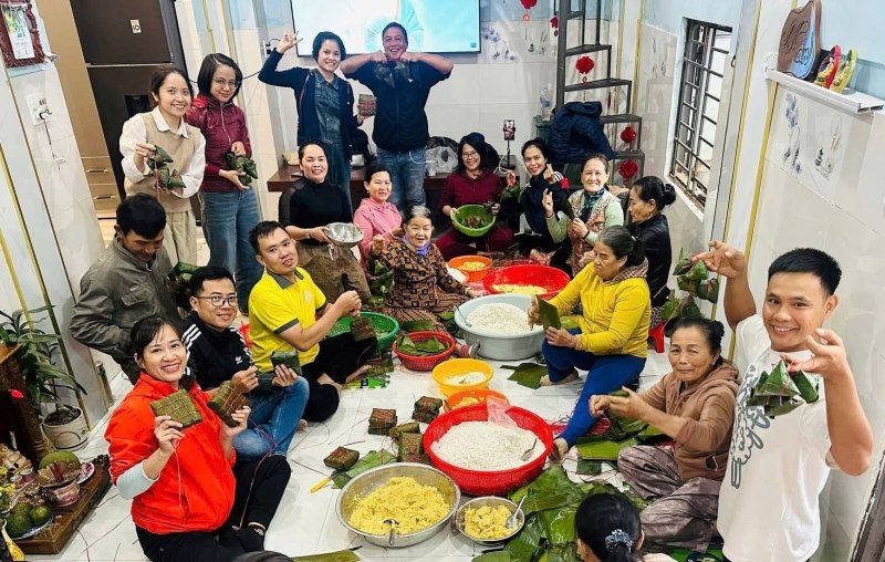 チエンダン村では、「Ket noi yeu thuong」グループが急いで餅を包んでいます。すべての葉、すべての米粒が誠実さで包まれています。当初は1 000個と予想されていましたが、住民の協力により、2 000個の餅が増加しました。