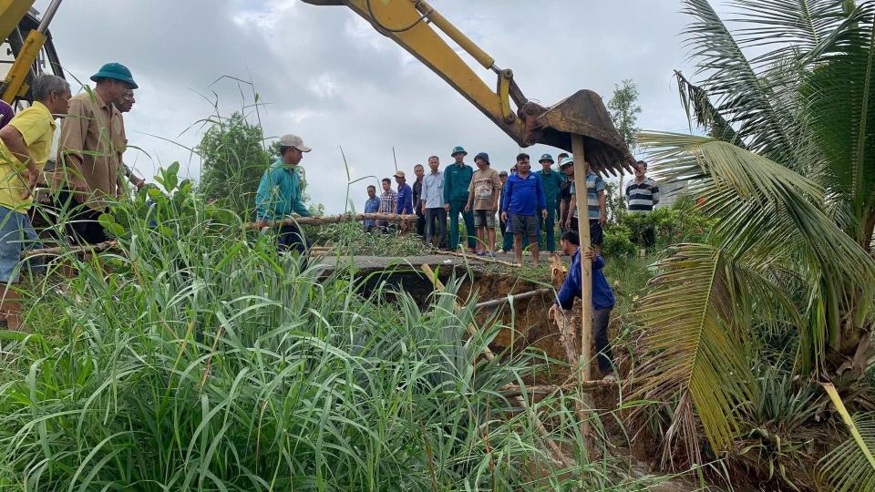 地元住民によると、同日午前4時頃、5号チャンネルの外側の水位が上昇し、大きな圧力がかかり、東海岸堤防を通過する地下水溝が崩壊しました。これは、国がプラスチック舗装に投資した農村交通道路を組み合わせた堤防線です。強い流れの圧力の下で、地下水溝の土壌は焦げ付き、水はすぐに農業生産用地に流れ込みました。