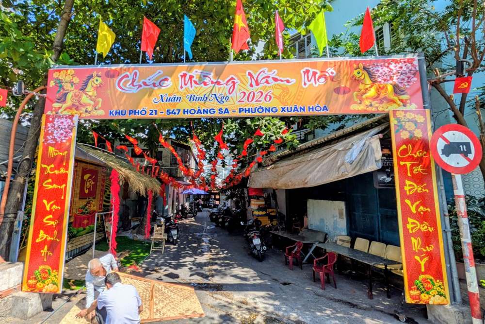 この数日間、「栄光ある党を祝う - 勝利の春を祝う」雰囲気が街の至る所に明確に表れています。ホアンサ通り、チュオンサ通り、タインダ半島の堤防沿いの住宅地では、赤い国旗が梅の枝や桃の枝の色とりどりに舞い上がります。人々は喜んで旗を掲げ、ミニチュア風景を飾り、故郷への愛と民族的誇りに満ちた空間を作り出しています。