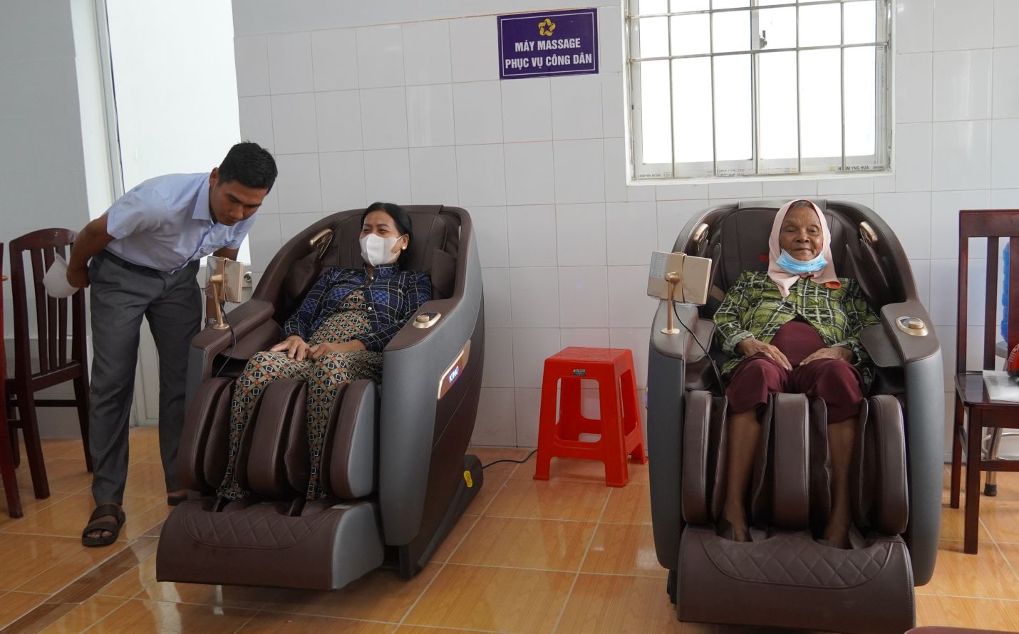 コミューン行政センターにはマッサージチェアがあり、貧困世帯への郵送書類支援も行っています。