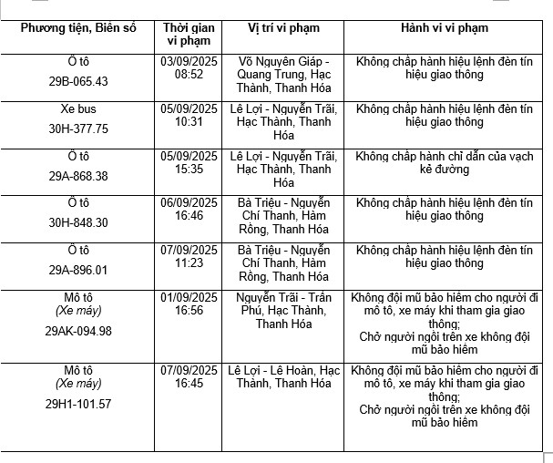 Thanh Hoa省警察交通警察署によると、9月1日から9月10日まで、警察は多くの交通違反を処罰しました。その中には、ハノイナンバープレートの車両が次のようにマークされています。