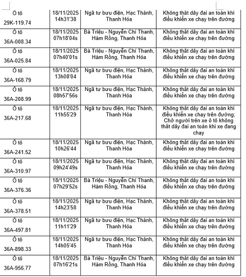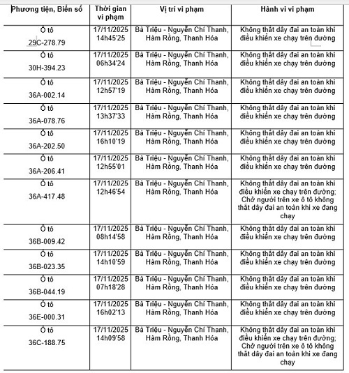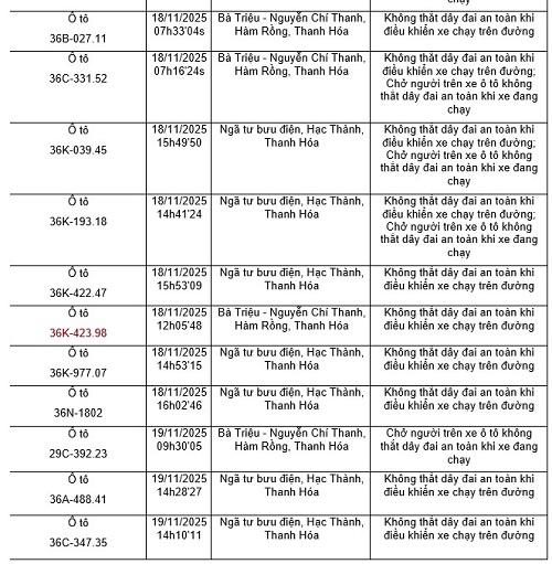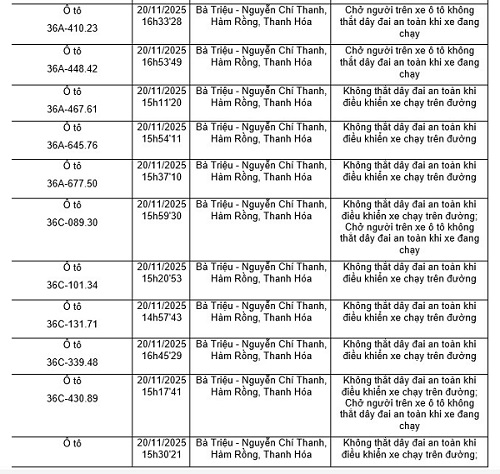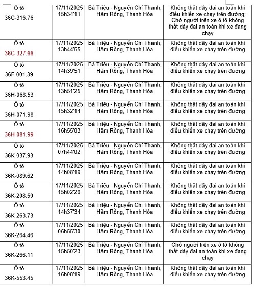 タインホア警察は、治安、交通安全、交通安全監視カメラシステムを通じて、交通安全秩序違反車両の発見結果を発表しました(2025年11月17日から2025年11月23日まで)。このうち、多くの車両所有者は、安全ベルトを閉めない、手で携帯電話を使用しない違反で罰金を科せられました。代表的な例は次のとおりです。