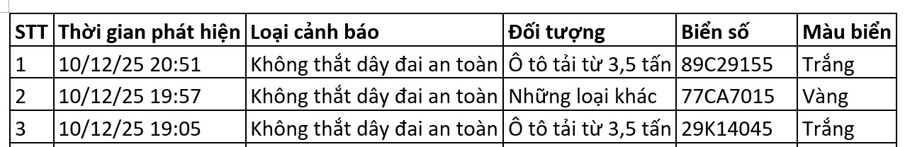 交通警察署は、2025年12月10日正午から2025年12月11日正午までの間、ノイバイ~ラオカイ高速道路の20キロ地点にあるA.Iカメラが、シートベルト未着用の事例を3件記録したと発表した。リストは次のとおりです。
